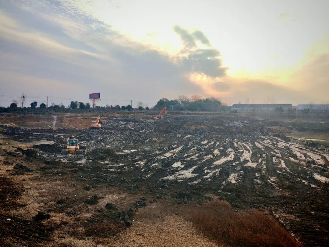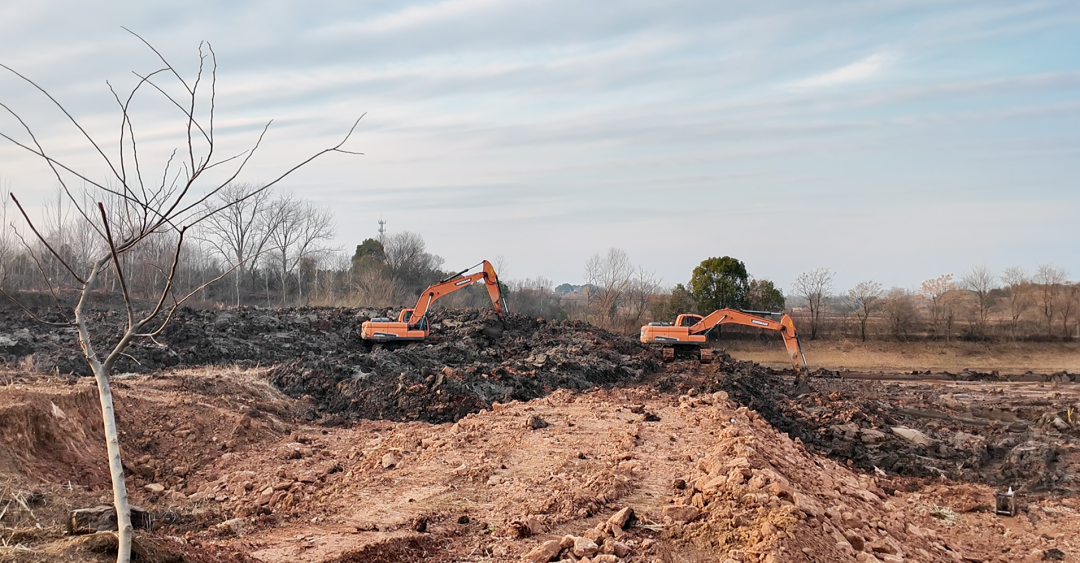 兩臺大型挖掘機正在對泗水橋村新擴挖的塘堰進行最后清理 圖片來源:東寶區水利和湖泊局