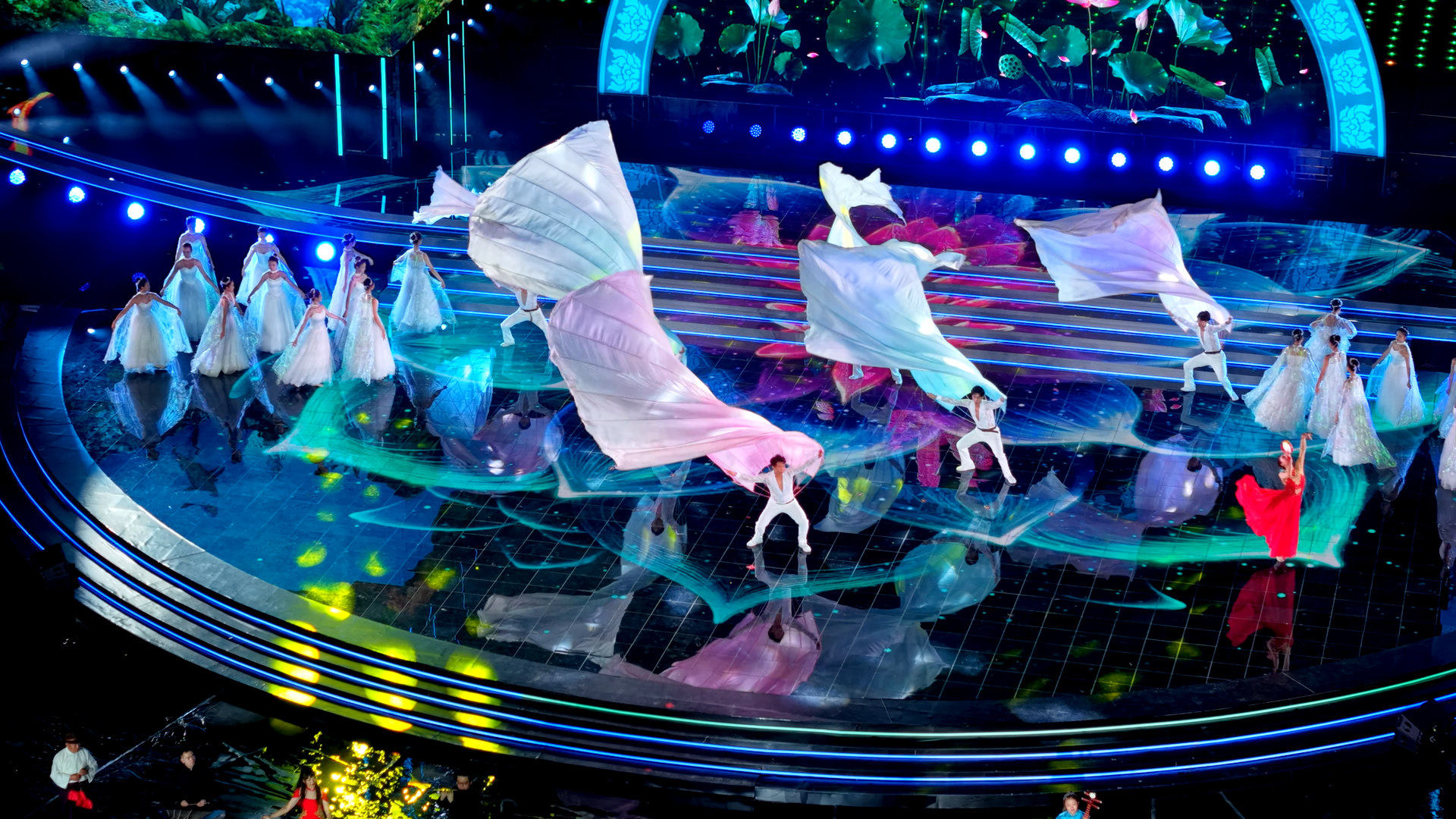 科技為這首永恒的詩篇注入了新的韻味。夜空中的無人機以天為幕,以光為筆,勾勒出“江豚逐浪”的靈動畫面。這些長江的精靈,曾經瀕臨滅絕,如今再度暢游江中,成為生態改善的最好見證。電子編鐘與真人舞蹈交織,古琴、鷹笛、竹笛等傳統樂器與西洋樂器合奏,營造出“江天一色”的壯麗景觀。科技讓傳統文化煥發新生,讓千年文明在新時代綻放異彩。