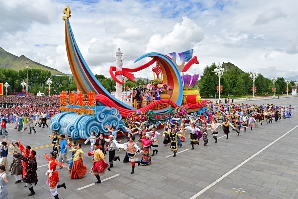△8月21日上午,西藏各族各界干部群眾約2萬人歡聚拉薩市布達拉宮廣場,熱烈慶祝西藏自治區成立60周年。這是游行的彩車通過布達拉宮廣場。