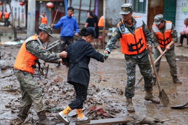 △2025年8月9日,武警甘肅總隊機動支隊官兵在蘭州市榆中縣城關鎮興隆山村幫助受災群眾通過淤泥區。