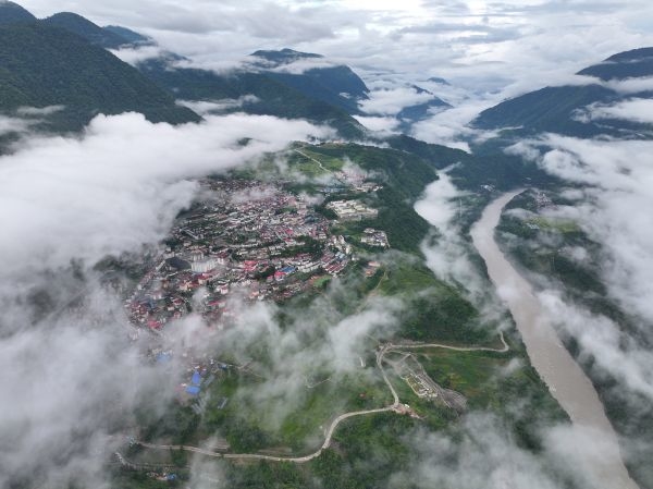 △2025年7月29日,西藏自治區林芝市墨脫縣城云霧縹緲。城市、山巒與蜿蜒流淌的雅魯藏布江相互映襯,宛如一幅美麗的生態畫卷。
