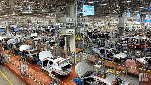 △廣汽埃安總裝車間智能生產(chǎn)線。(總臺(tái)央視記者趙化拍攝)