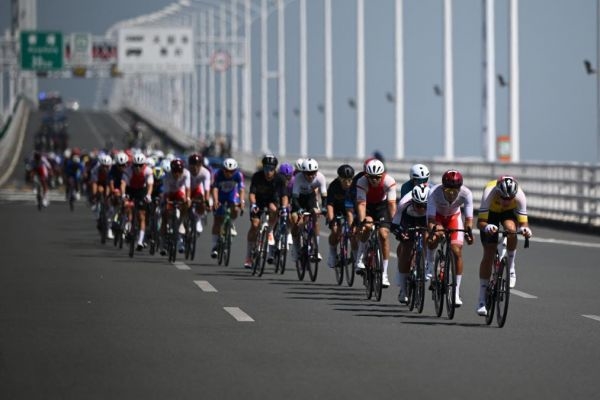 △2025年11月8日,第十五屆全國(guó)運(yùn)動(dòng)會(huì)公路自行車男子個(gè)人賽決賽開(kāi)賽。圖為參賽選手經(jīng)過(guò)港珠澳大橋。